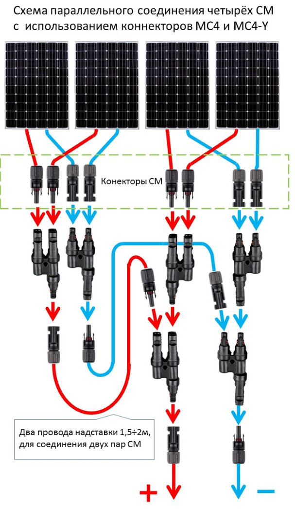 При параллельном соединении двух модулей 100Вт 12в получаем мощность 200Вт 12В и т.д.